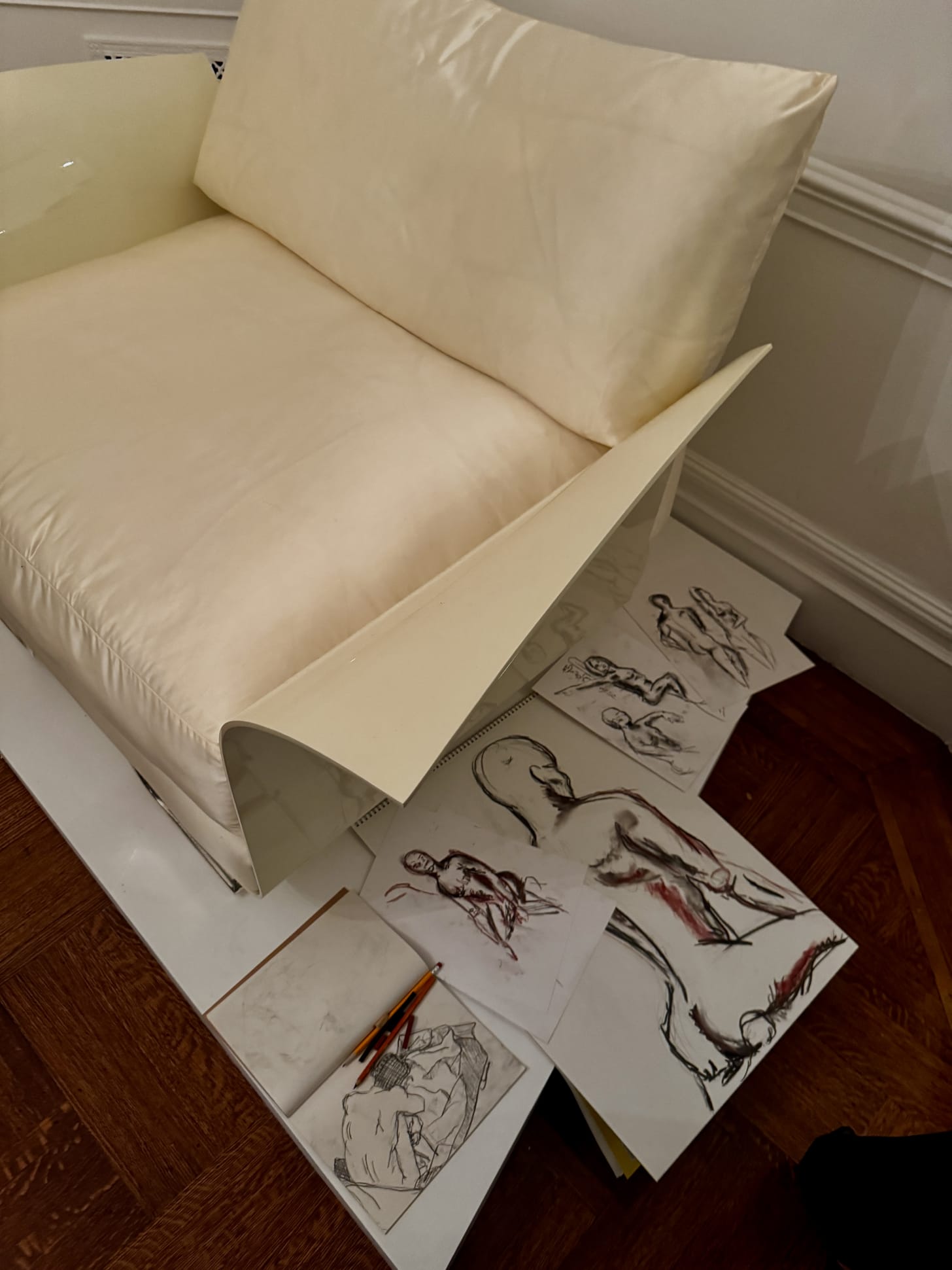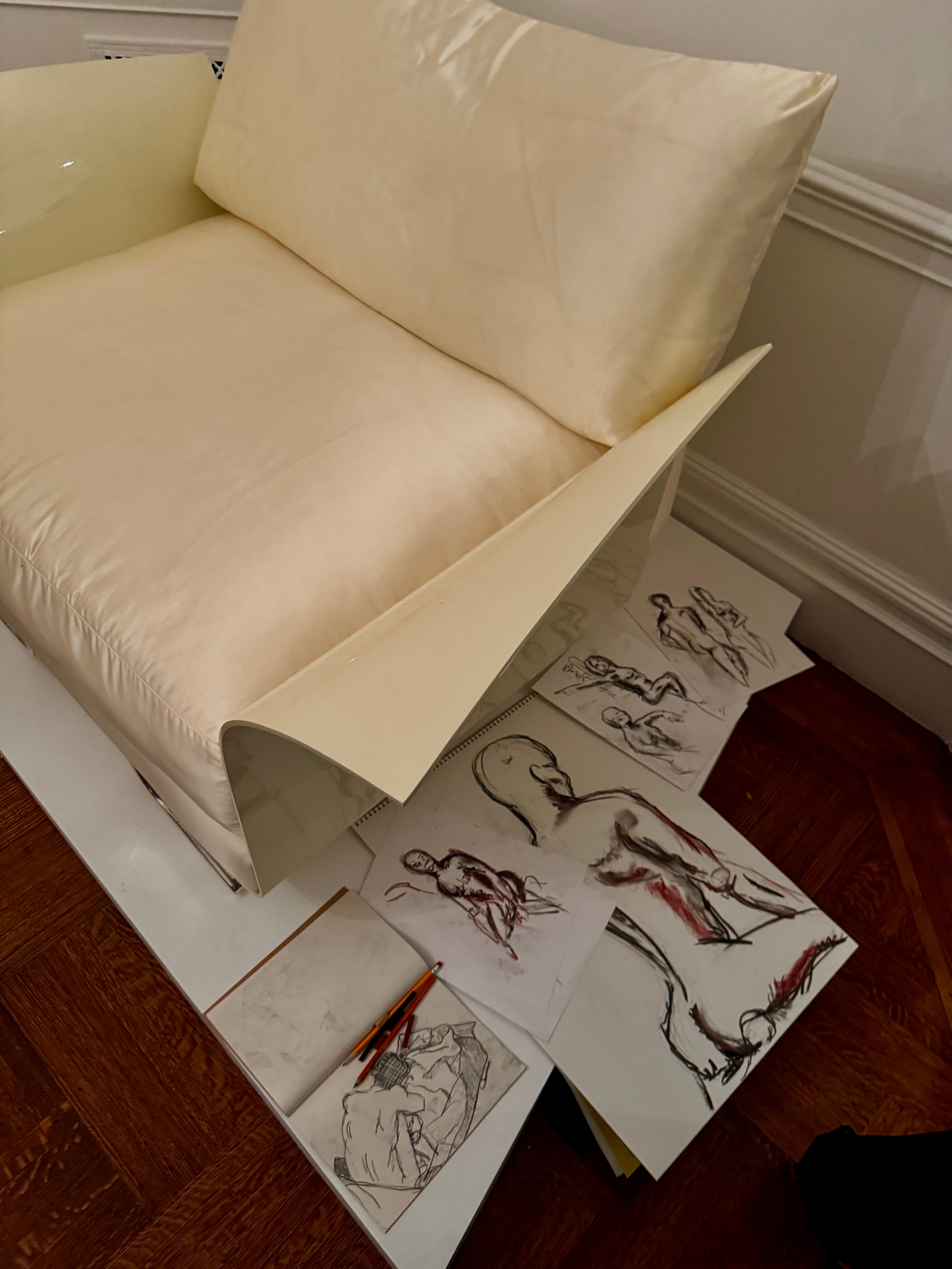 I spent a rainy evening last week tucked inside one of the chicest townhouses on the UES - Ashlee Harrison’s design salon, where figure drawing met furniture preview in the most casually elevated way. The space is currently featuring work from California-based designer B G Robinson, whose pieces are the love child of sculpture and interior design: curving, otherworldly shapes upholstered in lustrous silk that look as at home in a museum as they would in a very glamorous living room. The materials and techniques are ultra-engineered, but the overall effect is indulgent, almost decadent (see the chair pictured below).